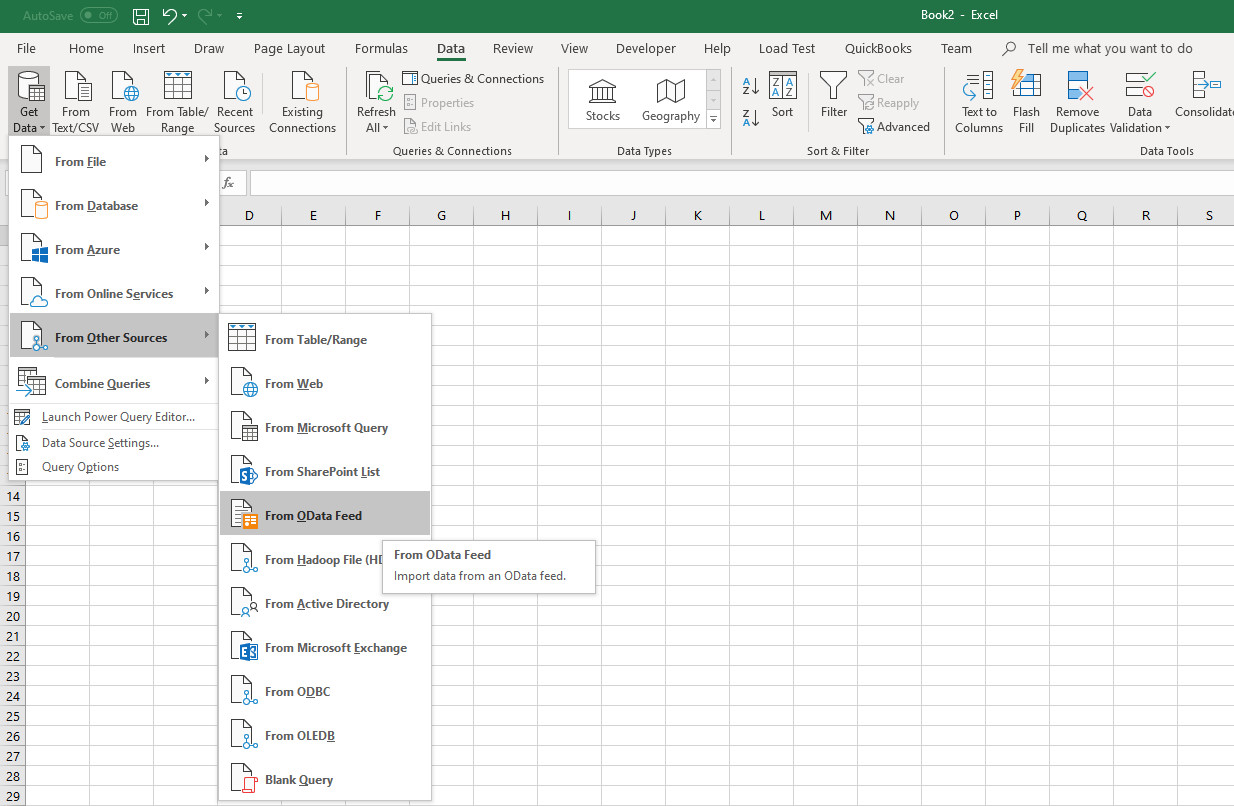 As an example in Excel, go to the Data Tab, Get Data, From Other Sources, From Odata Feed