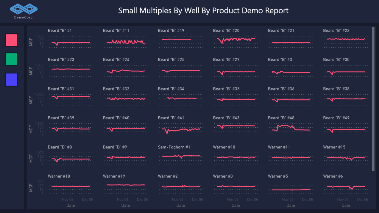In this sample, I configured a BOE time series line chart using small multiples by Well Name and configured the grid layout to 6 rows and 1 column. If you have a slicer that you would like to add some context to, you can utilize an approach like this.